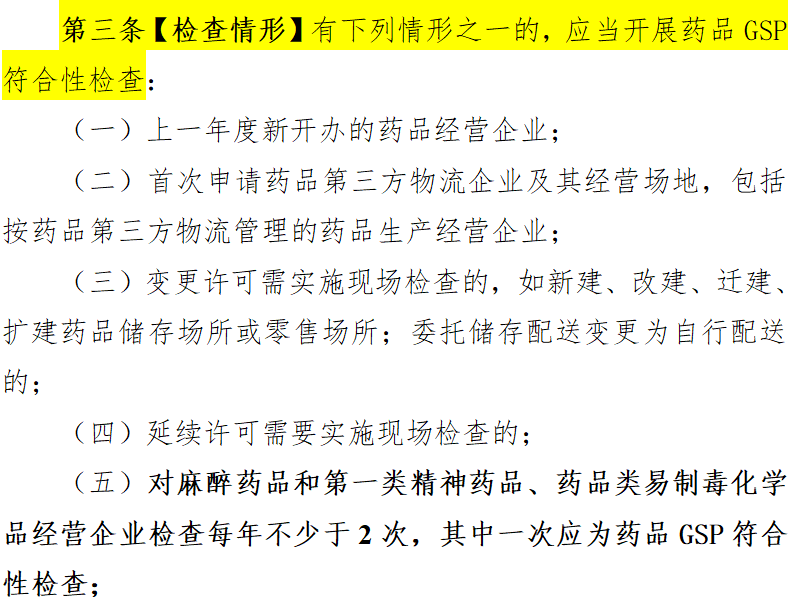 除首次许可检查、首次报告事项、延续许可检查、暂停经营或停业整顿涉及的药品GSP符合性检查外,其他情形应当列入当年检查计划,结合常规检查进行。