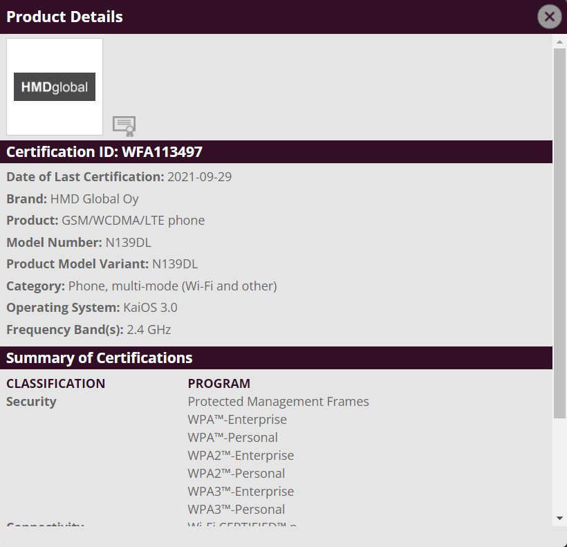IT之家了解到,诺基亚 N139DL 早些时候已经出现在 WiFi 认证官网,搭载 KaiOS 3.0,支持 4G 网络、2.4GHz 网络。