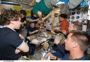 国际空间站上的机组人员一起享受吃饭。NASA