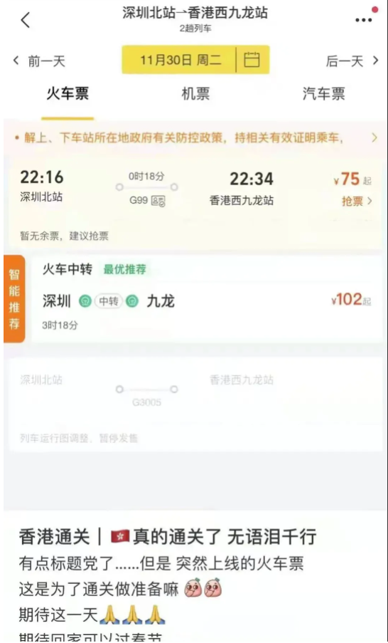 就在昨天,有心的網友突然發現,內地鐵路訂票網站12306顯示,由11月30日起,每日會有一班高鐵,車次編號G99,由上海經深圳往香港西九龍站。雖然網頁顯示只有候補票,未能購票。但還是讓一衆網友激動萬分:「真的通關了,無語淚千行」。