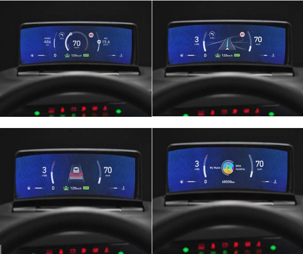 该显示器由四个显示区域构成。上部三个显示区域主要显示速度、转速、ADAS和导航等相关信息;下部一个显示区域主要显示换挡模式、冷却液温度和行驶里程等车辆基本信息。此外,转向灯、系统信息警告灯的功能也在下方区域显示。因此驾驶员不用低头,也不用扭头,就能看到行驶信息,不仅有效的提升驾乘体验感,还对行车安全性的提高有很大帮助。
