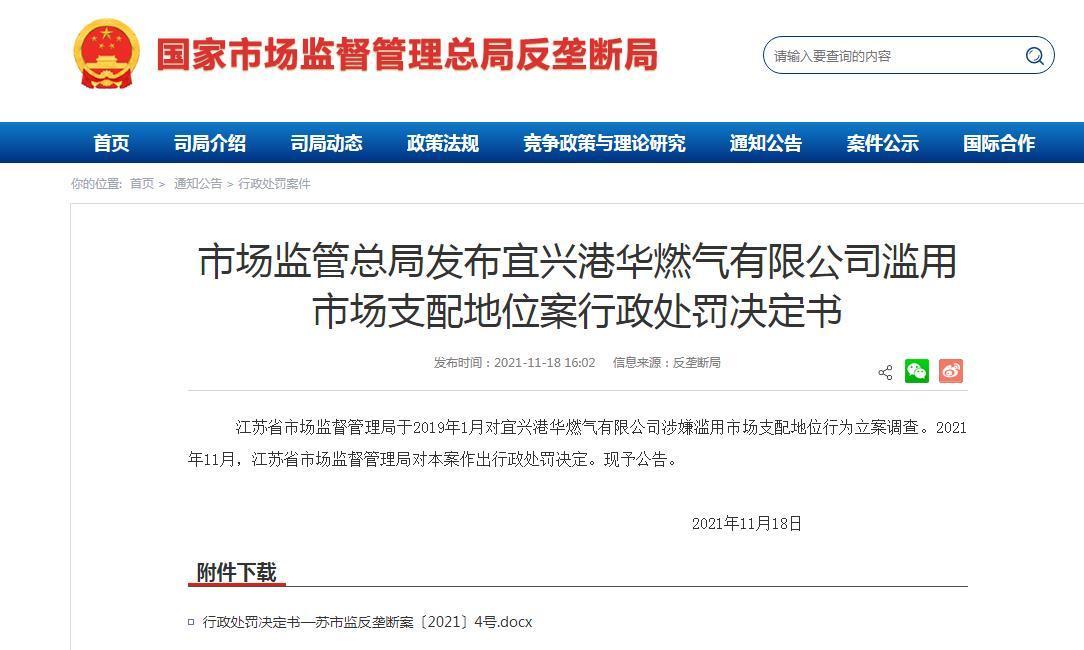 11月18日,在国家市场监督管理总局办公大楼,国家反垄断局正式挂牌当天,反垄断局官网发布了宜兴港华燃气有限公司(下称“宜兴港华燃气”)滥用市场支配地位案行政处罚决定书(下称“《决定书》”)。江苏省市场监管局对宜兴港华燃气处以上一年度销售额2%的罚款(约3500万元)并没收其违法所得,合计金额超过4000万元。