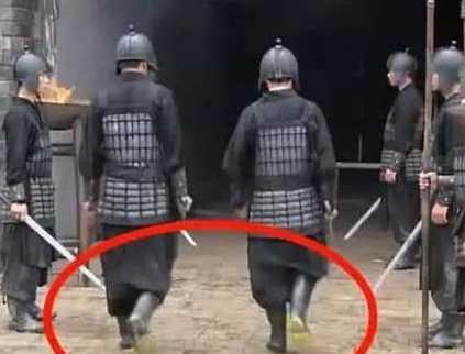 这是一部古装戏,铠甲士兵站在巡逻,但是请宝宝们仔细看这两位正在走动的士兵的脚,好像很熟悉的样子。对,自信点,你没看错,就是雨靴!不用看就知道是穿帮镜头了啊,不知道你们在看这部电视剧的时候注意没注意到呢?