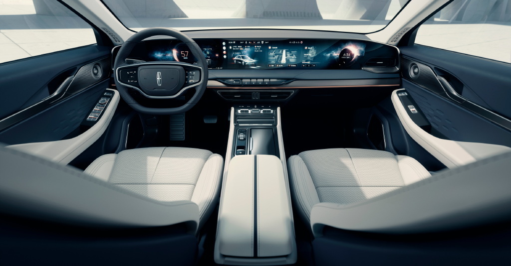 内饰方面,林肯Z绝对让人感到惊喜连连,整个仪表台就是一块大屏幕,看上去就像外星飞船一样科幻,中控设计简约时尚,保留了一些必要的按键,实用性很好,方向盘的造型很复古,看出来一些曾经的美式奢华感,座椅的设计沿袭了林肯的独家风格,用料考究,细节精细,舒适度也是上佳,空间表现也让人满意,128色氛围灯绝对诚意十足。