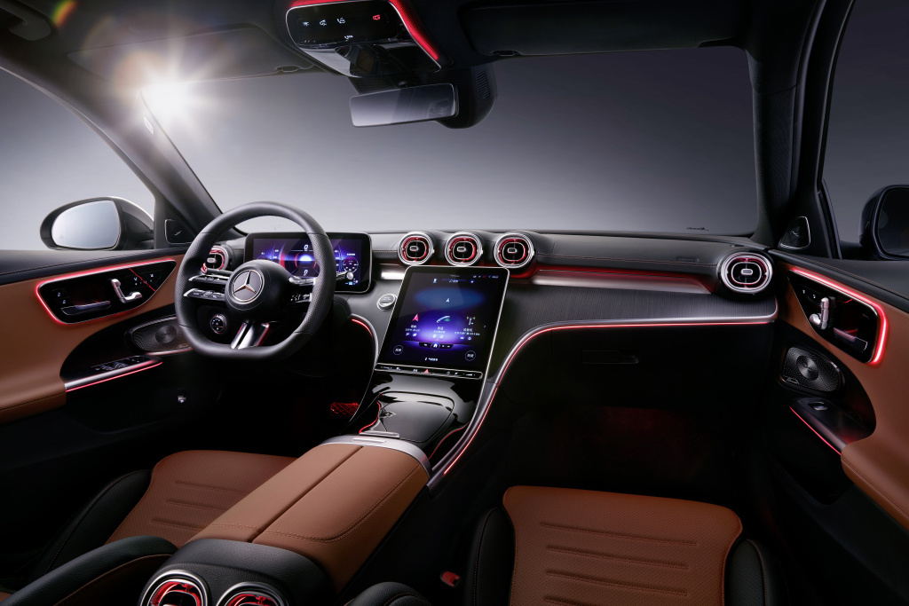 奔驰的内饰绝对让人惊叹,采用了S级的设计语言,但是出风口的设计比S级的更漂亮,虽然大屏幕有点突兀,实用性也有疑问,但是在电动车当道的时代,大屏是现代化的象征,方向盘设计也是亮点,非常华丽运动,手感极佳。C级的座椅也采用了运动风格,包裹性极佳,不过前排座对体型要求比较严格,太胖的人可能会觉得有点挤。C级内饰的氛围灯是一绝,奔驰在这方面无人能及。