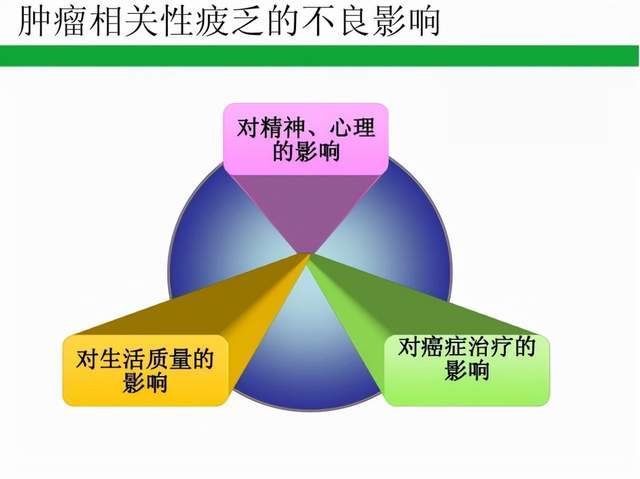 肿瘤患者术后或放化疗后容易出现疲乏状态,主要表现为全身乏力、易疲劳、嗜睡或失眠、注意力不能集中、记忆力减退、肢体沉重、行动迟缓、易怒、易于悲伤等,这是一种主观的、持续存在的疲乏感,很难通过休息得到缓解。