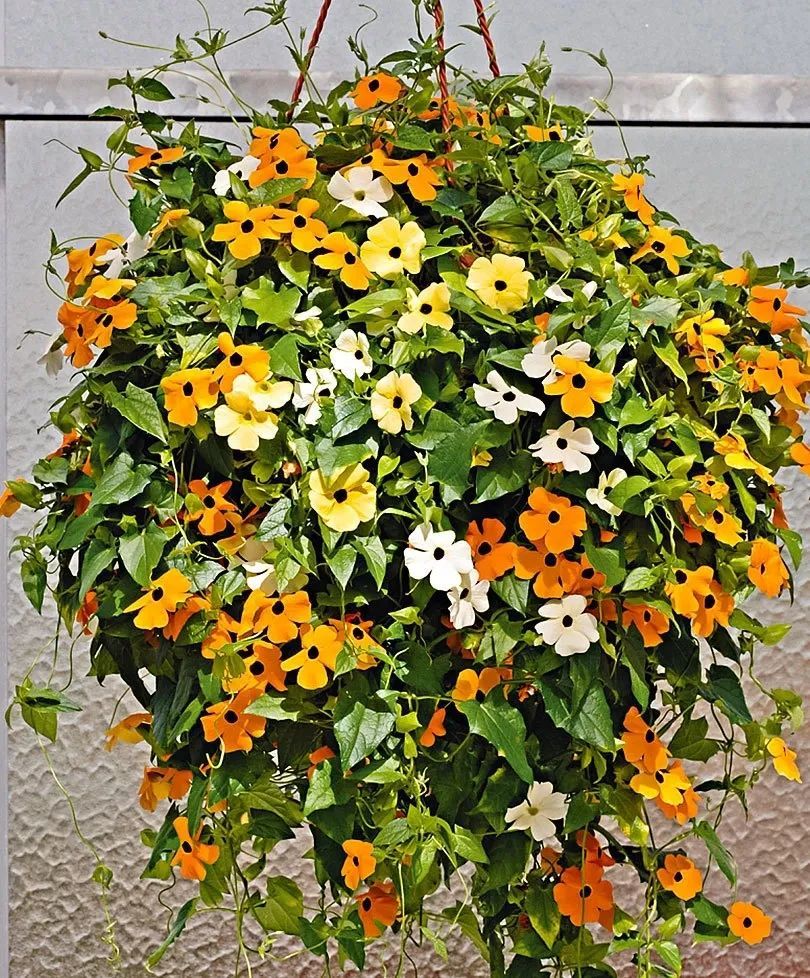 黑眼苏珊是一种藤本植物,可以养成吊盆花卉,让它的茎叶低垂生长。黑眼苏珊有着翠绿的叶片和迷人的黄色或橙色花朵,而花蕊处则是黑色的。