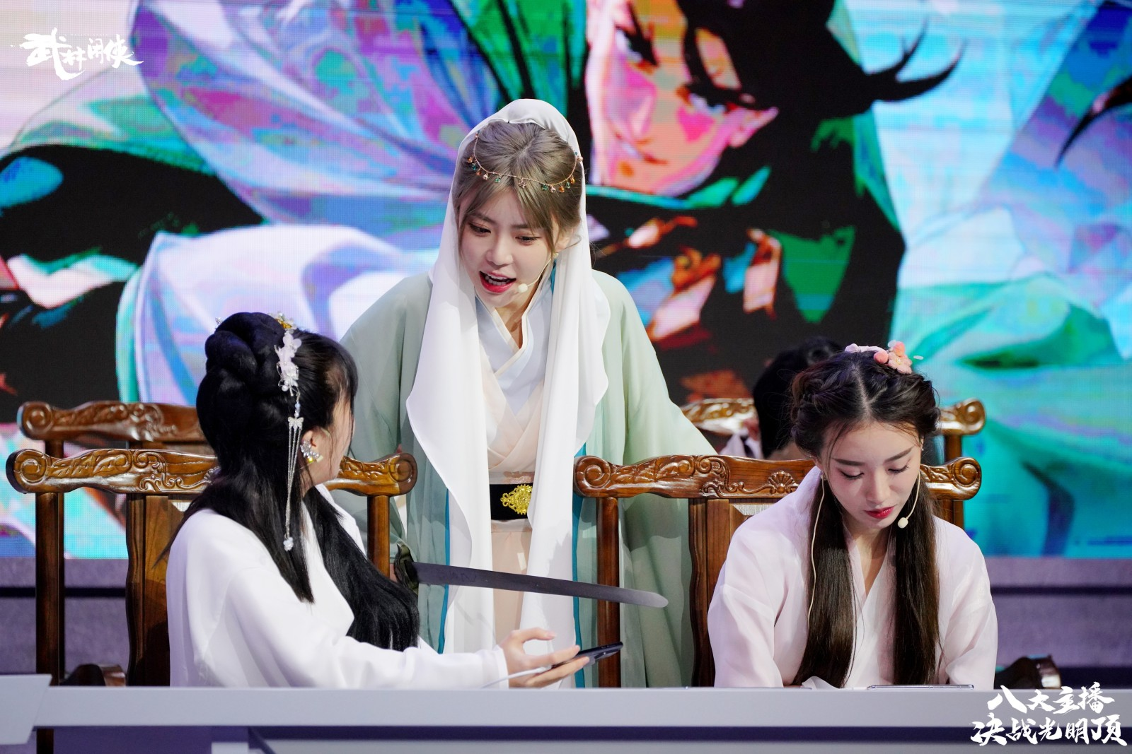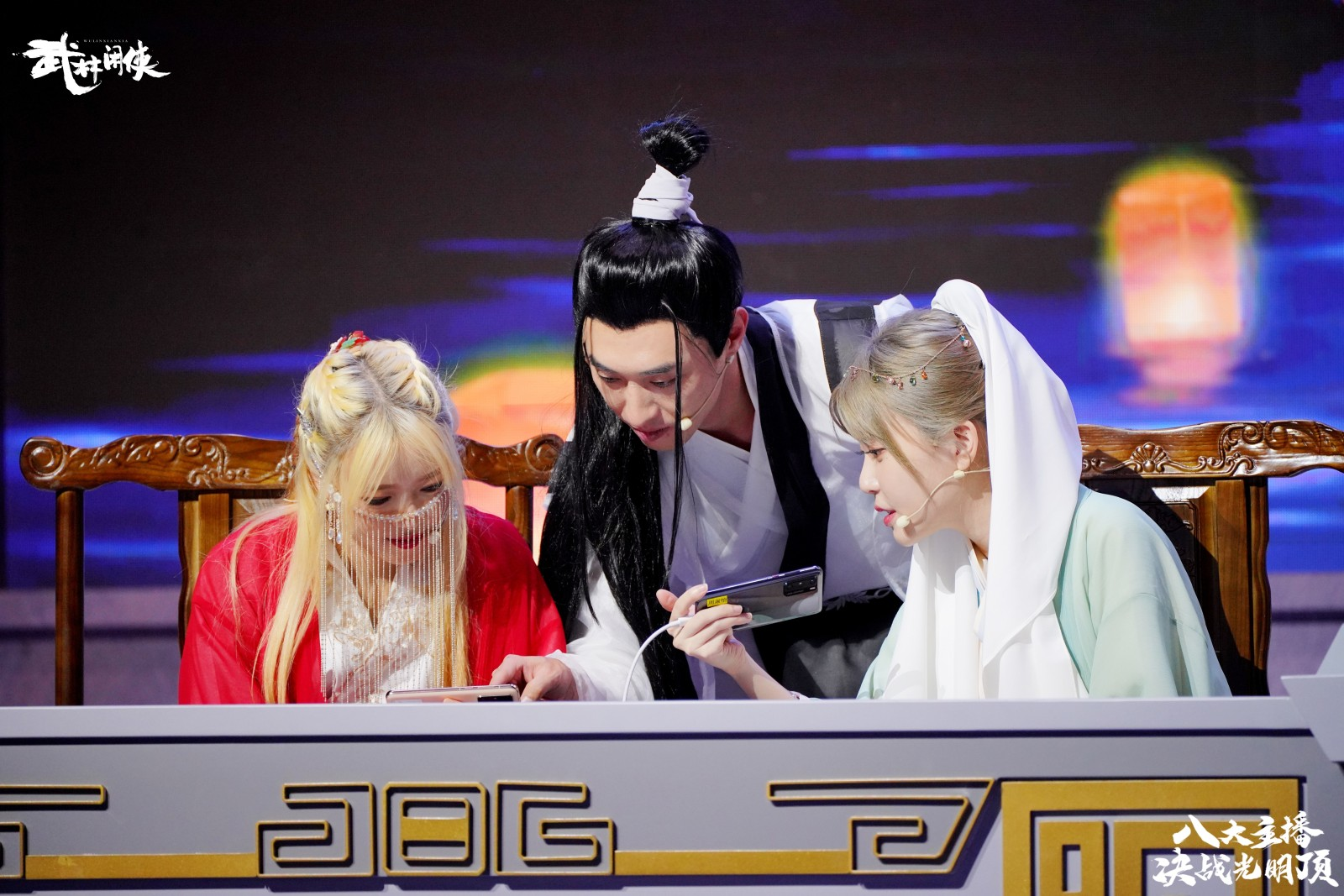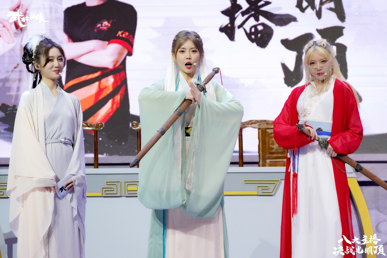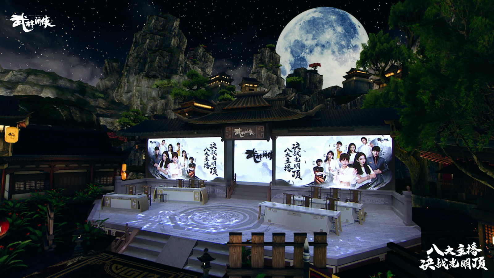 节目在一座充满国风武侠格调的擂台之上展开,以夜幕下的光明顶为原型进行搭建,武侠气息浓烈。随着一段古风舞蹈的预热,直播节目正式拉开帷幕。