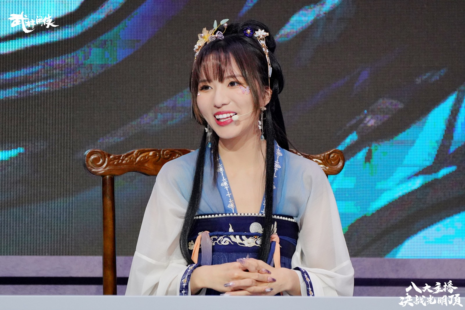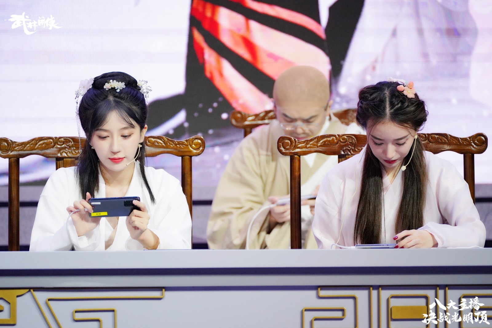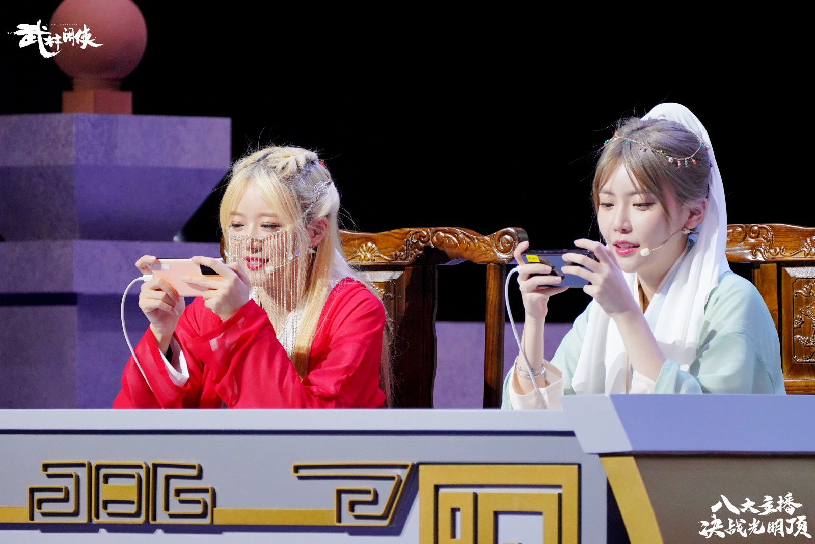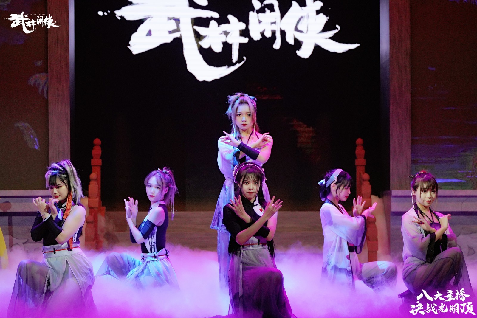 节目在一座充满国风武侠格调的擂台之上展开,以夜幕下的光明顶为原型进行搭建,武侠气息浓烈。随着一段古风舞蹈的预热,直播节目正式拉开帷幕。