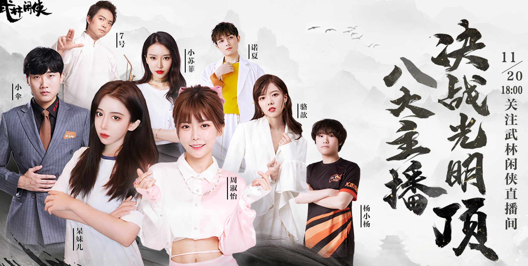 本次直播特别节目以武林经典之战——“决战光明顶”为背景,邀请周淑怡、骆歆化身明教队,呆妹儿、小苏菲、诺夏、7号、小伞和杨小杨六位主播化身江湖队,上演“六大门派围攻光明顶”的名场面。