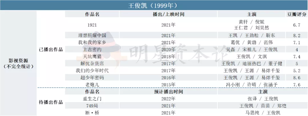 99年的王俊凯,是养成系爱豆转型的代表,他有较高的起点,却没有大爆的影视剧作品。此前他主演的《天坑鹰猎》获得豆瓣7.4分,而《解忧杂货店》《上古密约》评分均不及格。近几年,王俊凯也积极往正剧圈靠拢,参演了《我和我的家乡》《794局》、《1921》、《理想照耀中国》等多部主旋律作品,但或是作品未播,或是镜头寥寥,也未能实现真正的突破。