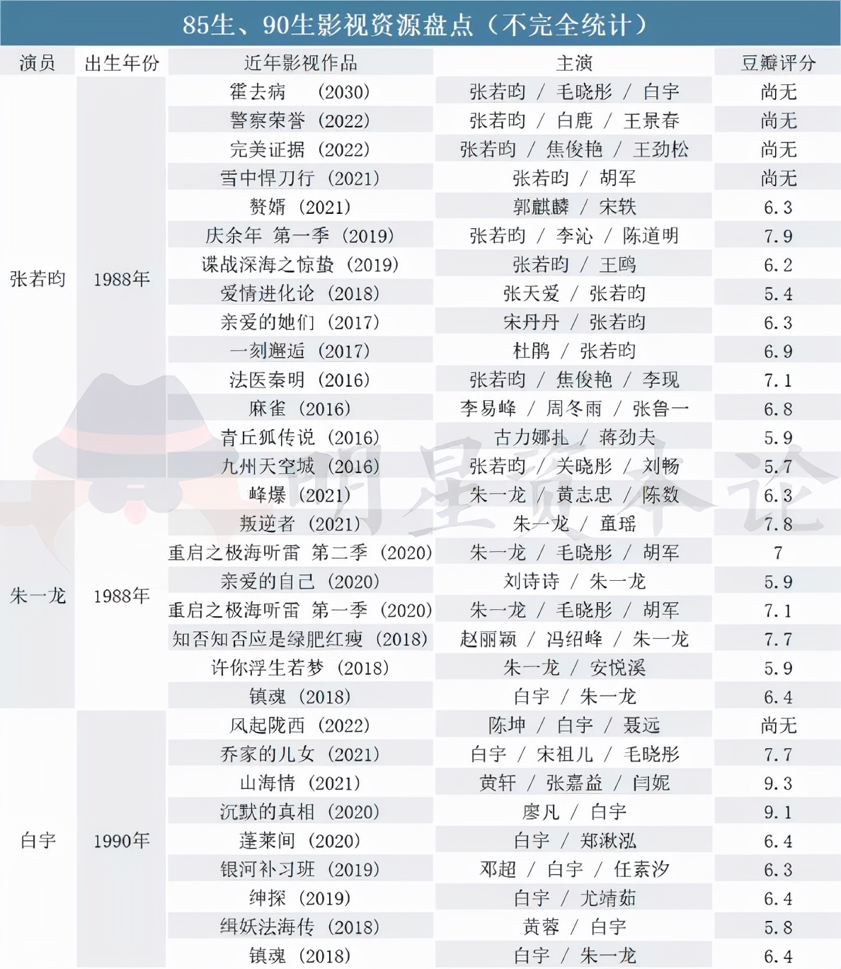 有,85后的张若昀可谓范例。在口碑悬疑剧《法医秦明》爆红网络前,张若昀也出演了几部古偶剧,如《青丘狐传说》《九州天空城》,但评分都未达到6分的及格线。而《法医秦明》火了以后,张若昀在获得人气的同时,也借此成功转型。