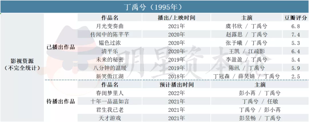 如丁禹兮95年出生,2020年因主演古偶剧《传闻中的陈芊芊》走红,之后又出演了甜宠剧《月光变奏曲》。后续还有多部待播作品,如《十年一品温如言》、《春闺梦里人》、《君生我已老》,基本上也都是甜宠古偶剧类型。