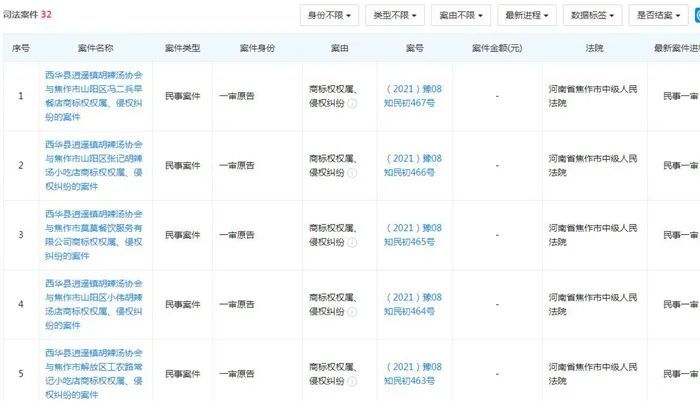 记者通过“企查查”查询发现,与“西华县逍遥镇胡辣汤协会”有关的民事案件有32件,而成为被告的胡辣汤商家涉及到焦作市、濮阳市、安阳市,且开庭时间多为2021年12月。