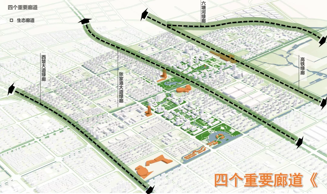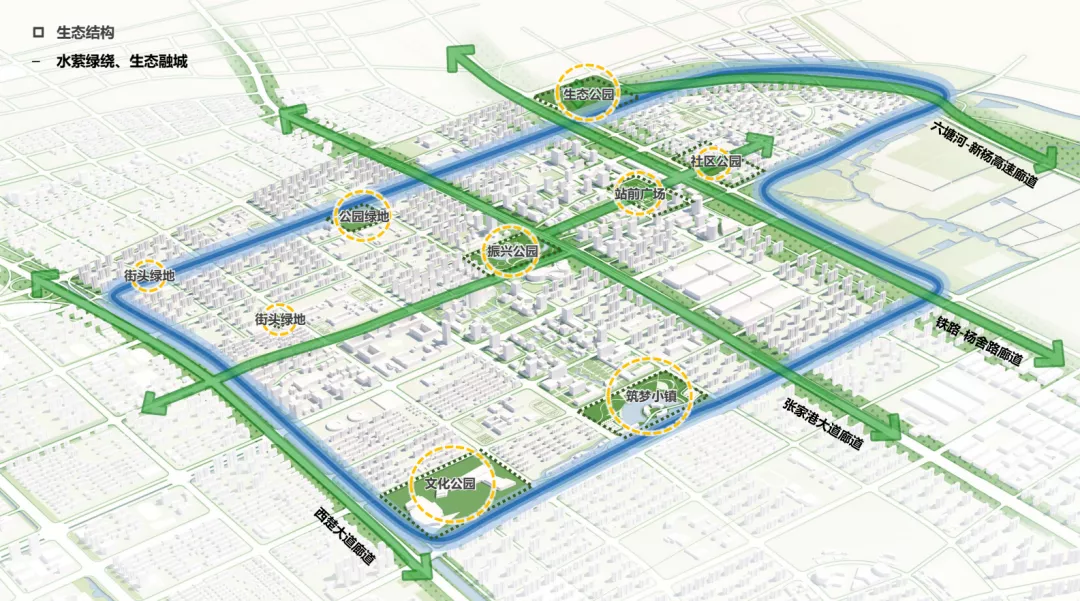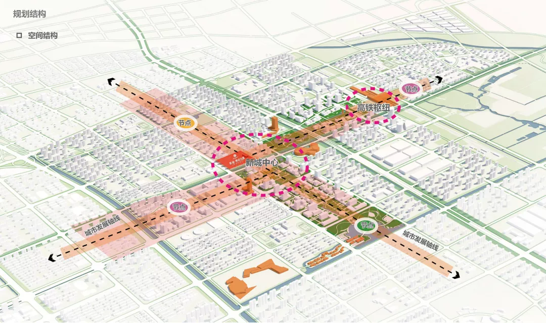 通过城市交通要道以及城市景观走廊,将高铁东站与城市中心紧密联系,同时以多元开发,形成站前枢纽区,激发高铁商圈。同时实现公/铁等立体交通快速衔接,城际/城市/城乡“0距离换乘”,打造宿迁中心城区东部对外交通枢纽节点,形成宿豫乃至宿迁的城市名片。