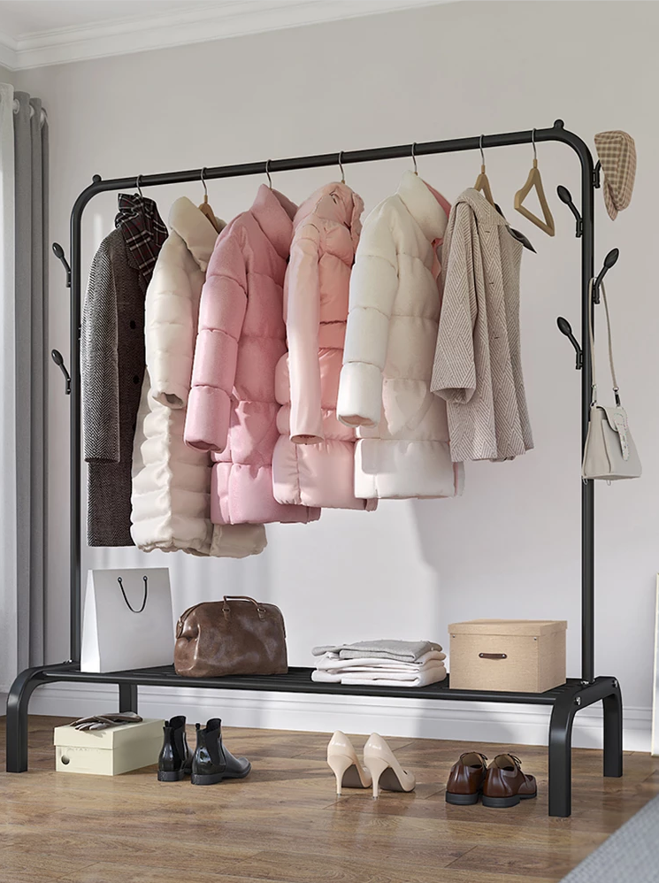 如果空间实在是小到没有办法放置衣柜的话,也可以用挂衣架来代替,它安装方便、颜值高、对于衣物的挂放一目了然,非常受年轻人喜欢,算是一件小卧室“神器”了。