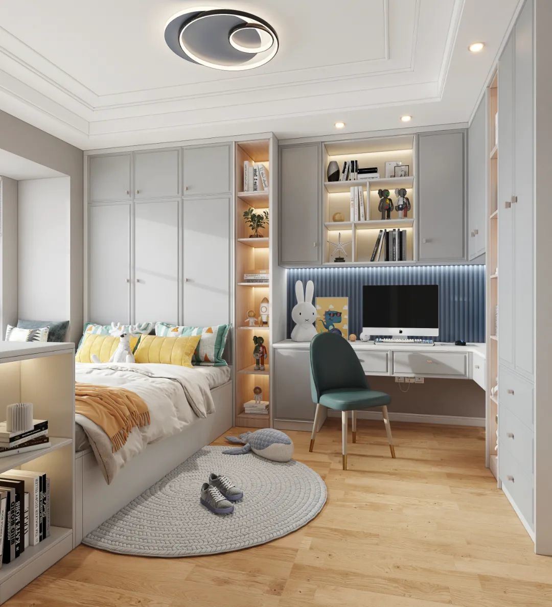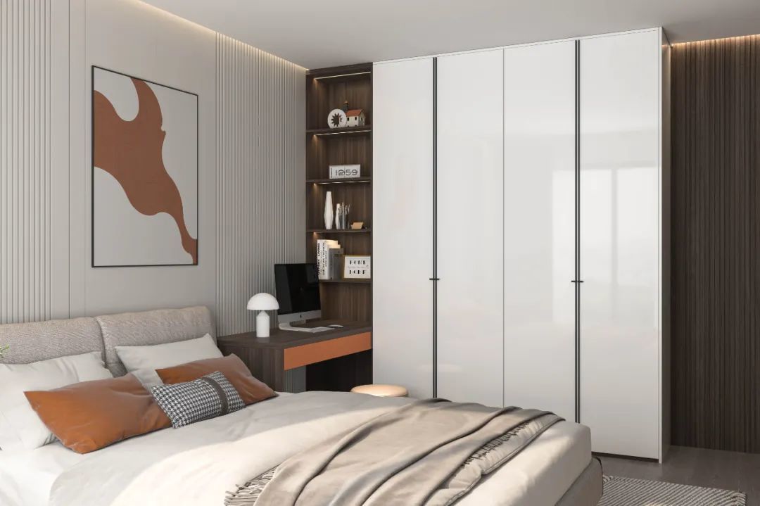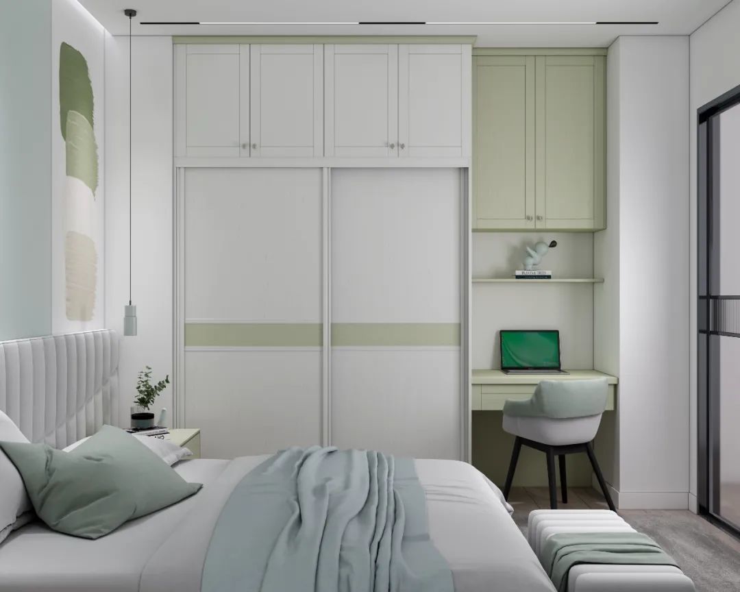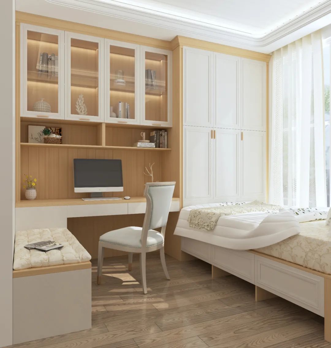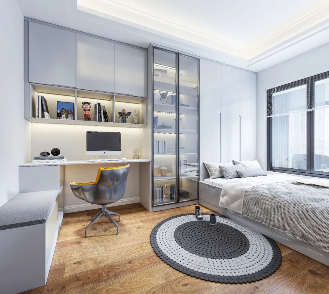如果想在次卧满足睡眠和收纳需求之外,再增加办公和学习功能,不妨试试一体式定制柜的设计。