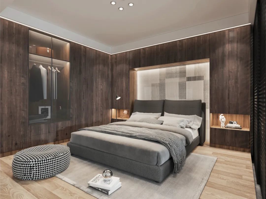 预算足够的话,还可以选择直接在床头背景墙定制收纳柜,内嵌置物格或者定制壁龛,放置常用的物品或者装饰品,不占据空间,但是又能满足床头柜的所有功能。