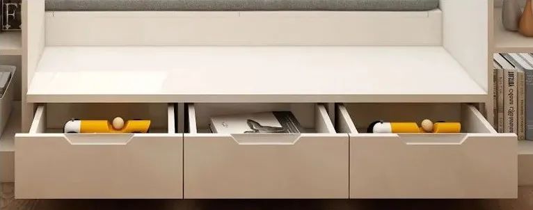 除此之外,在各种边角位置设置隐藏式抽屉也是不错的选择,像床下、榻榻米下或者飘窗柜都可以做成这种形式,不仅可以扩容收纳,让房间整洁有序,直接拉开也比较方便,不用搬走柜子上的物品。