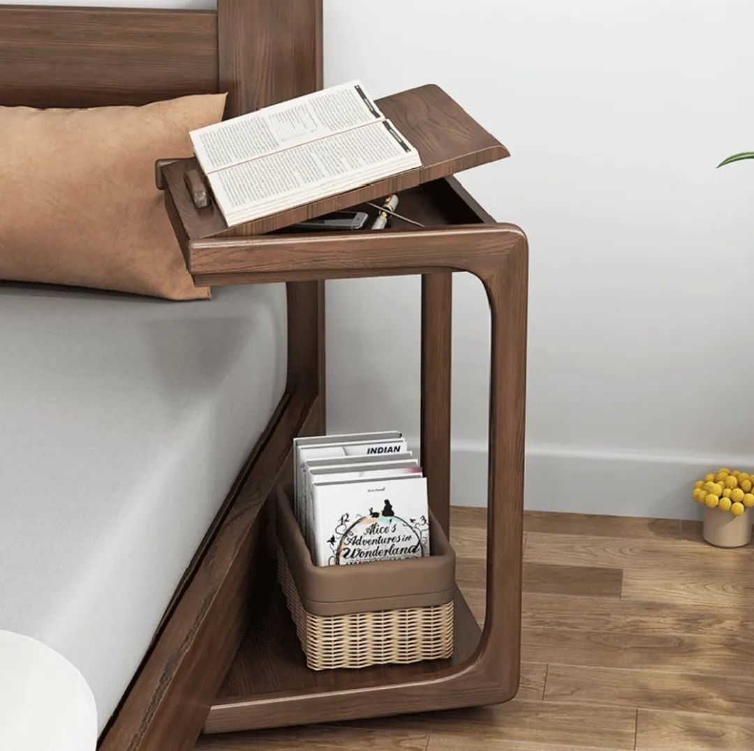 床头柜虽然方便随手置物,但是往往也占据了卧室的横向面积。可以选择利用可移动式边几代替床头柜,带有滚轮,不仅可以储物,还能调节面板高度,充当一个小小书桌,灵活实用。