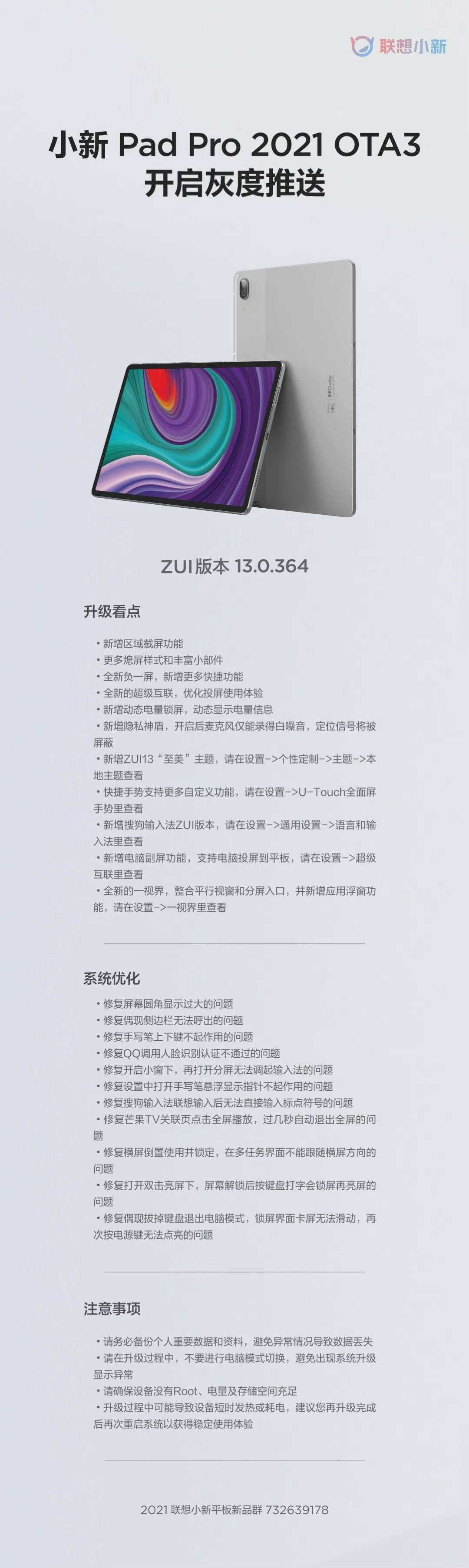 此外,小新 Pad Pro 2021 今日也迎来了最后一轮灰度推送,23 日 10:00 限时 4 小时灰度(今早 10:00)。