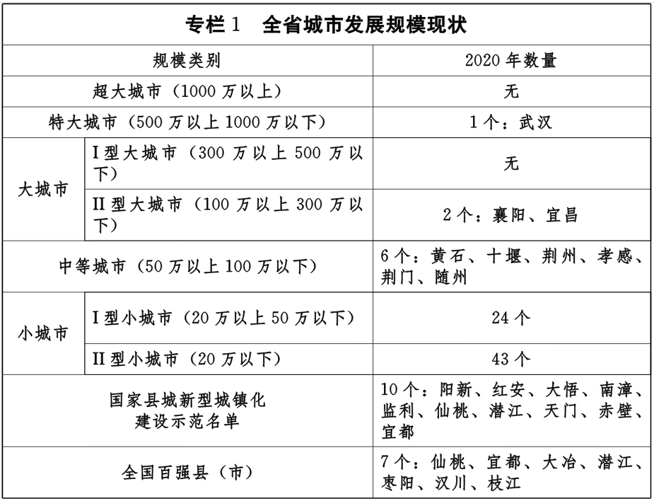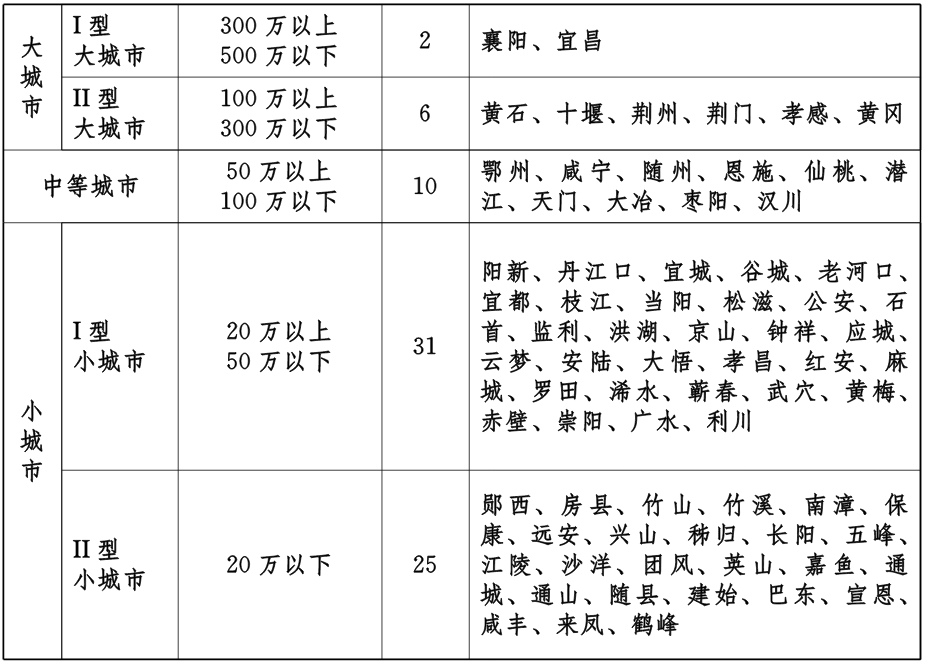 《规划》提出,到2035年,形成1个超大城市(武汉)、2个Ⅰ型大城市(襄阳、宜昌)、6个Ⅱ型大城市(黄石、十堰、荆州、荆门、孝感、黄冈)、10个中等城市(鄂州、咸宁、随州、恩施、仙桃、潜江、天门、大冶、枣阳、汉川),31个Ⅰ型小城市、25个Ⅱ型小城市的城镇规模体系。