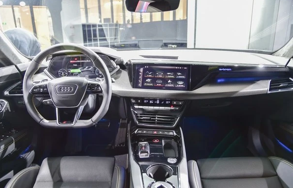 作为奥迪家族中首款旗舰高性能电动轿跑,车厢布局也完全看不到现有奥迪的影子,实体按键比起现款奥迪车型减少约50%。同时,搭载12.3英寸的全液晶数字仪表盘与10.1英寸的触摸式显示屏,两个屏幕均具有极高图形分辨率,视觉效果非常超越。另外,采用了三幅式方向盘,由真皮用料进行包裹,手感与触感均不错。换挡机构为电子滑动式布局,有种触摸时光的感觉。丹麦的Bang & Olufsen高级音响系统也出现在这台车上,为驾乘者带来置身音乐会的听觉享受。
