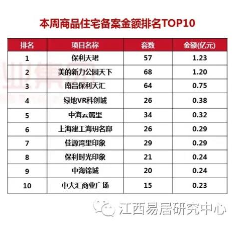 据江西易居研究中心数据显示,上周(11月15日-11月21日),美的新力公园天下备案金额1.2亿元,备案套数68套,排名楼盘成交榜第二位。