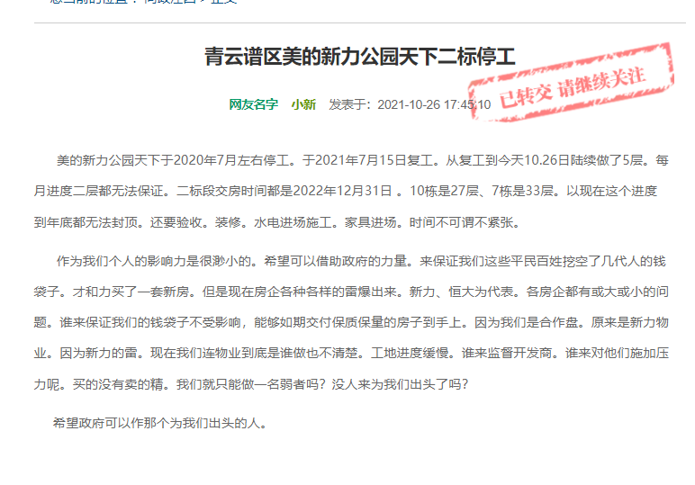 不过,在热销的同时,有业主在问政江西平台反映美的新力公园天下再次停工。