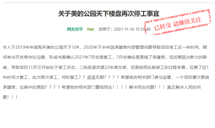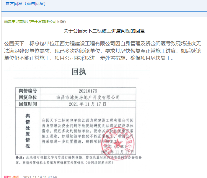 南昌市地美房地产开发有限公司于11月19日回复称,公园天下二标总包单位江西力程建设工程有限公司因自身管理及资金问题导致现场进度无法满足建设单位需求,现已多次约谈该单位,要求其尽快恢复至正常施工进度,如后续该单位仍不能正常施工,项目公司将采取进一步处置措施,确保项目尽快复工。