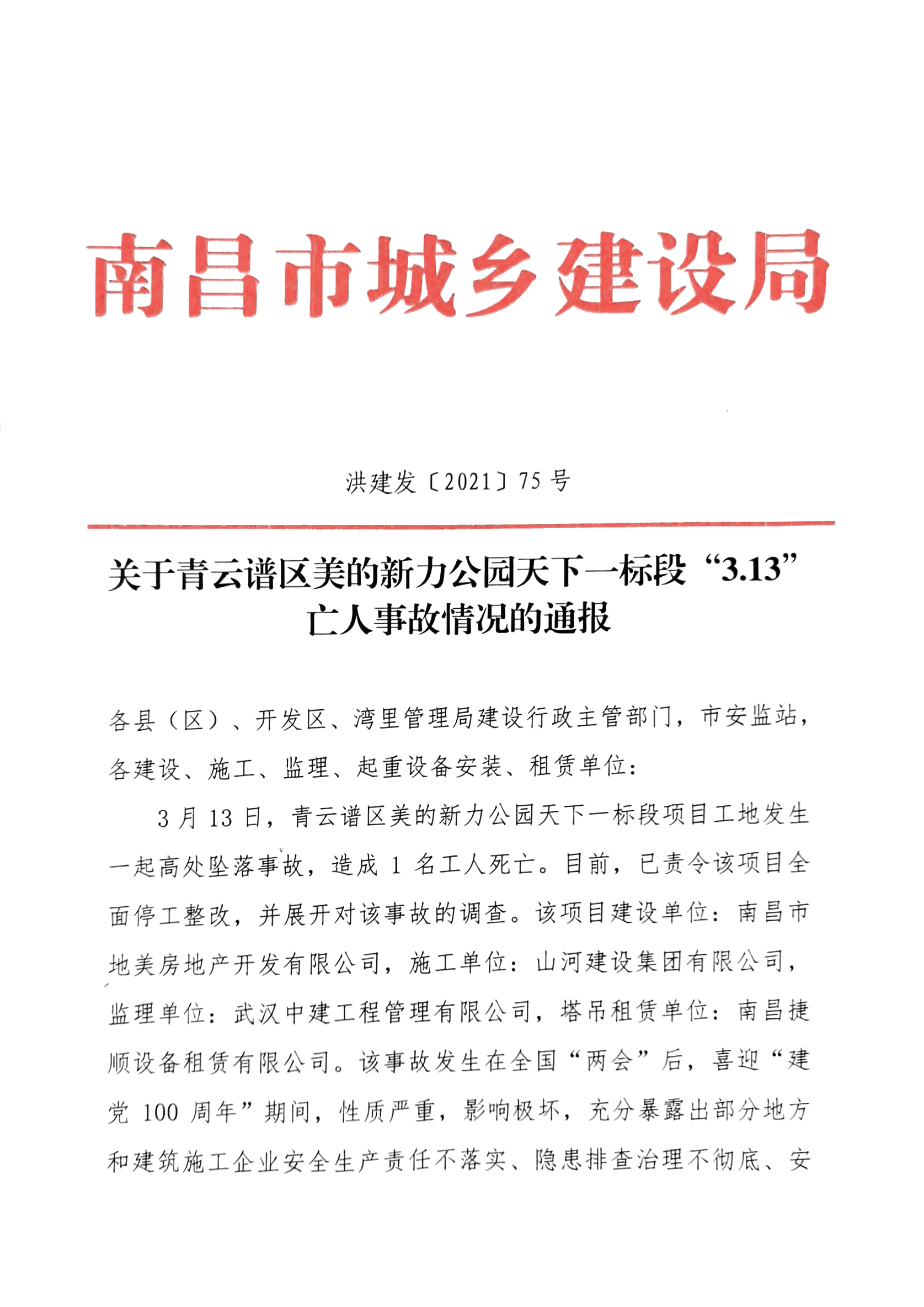 另据了解,今年3月13日,美的新力公园天下一标段曾因工程事故,被南昌市城乡建设局通报。