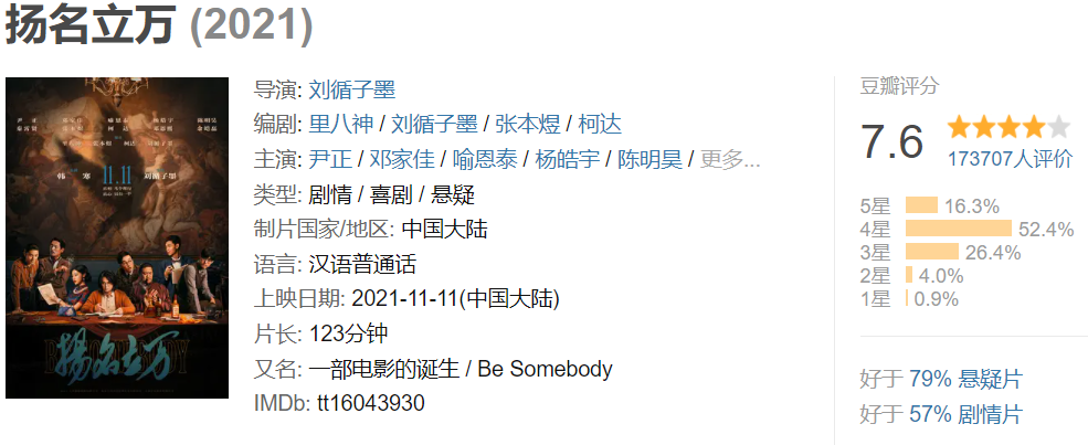 作为一部纯纯商业电影,双11上映的《扬名立万》豆瓣评分7.6,10天过去了,评分不仅没有下滑,而且票房还在继续上升。