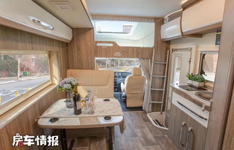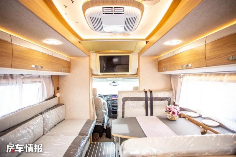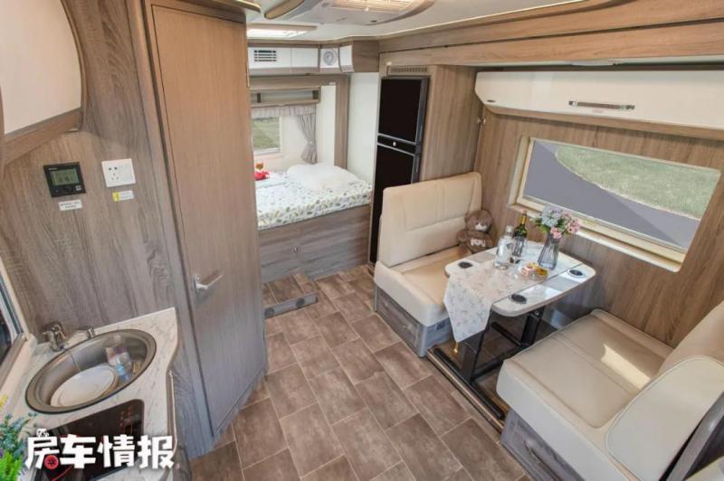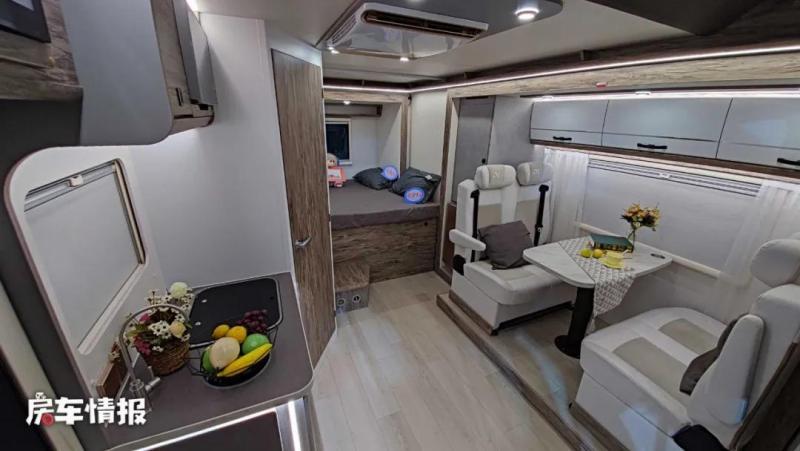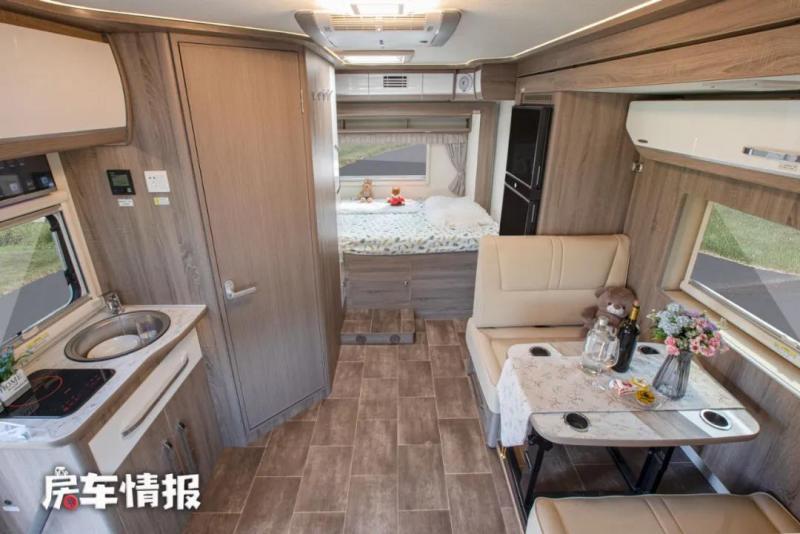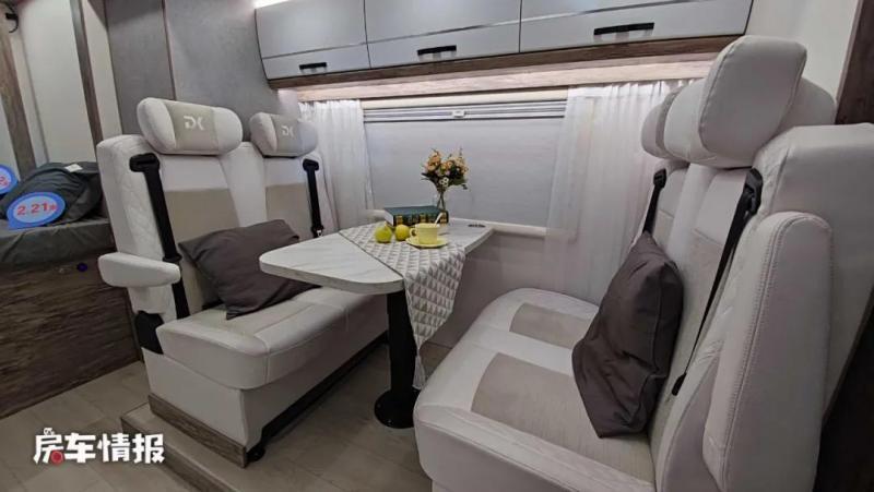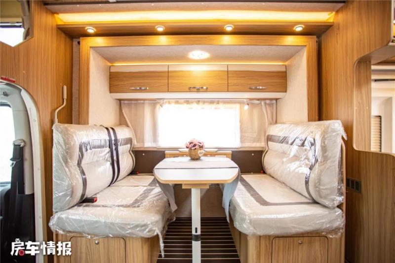 车厢内部采用了比较田园风的装修风格,整体的布局也是比较主流的双拓展布局。侧拓展舱内是以四人对卡座沙发+餐桌组成的会客区,不过看似平常且普通的设计,却暗藏玄机,关键就在于在会客区里隐藏了一张尺寸达到了1900*1900mm的超大双人床,平时 也不占用车内空间,使用的时候操作也比较简单,而且这张床据说还申请了专利,真的是非常新颖而且有创意的设计。