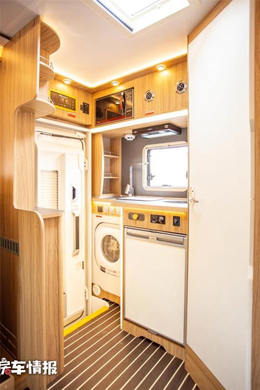 因为采用了后上门的设计,所以整体内部还是使用了后置厨卫区的布局,临近门口处的厨房操作台上配备了大功率的电磁炉和带盖的水槽,上方提供了抽油烟机和微波炉,下方也嵌入了一台洗衣机,以满足基本的生活需求。