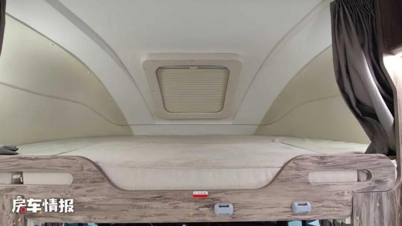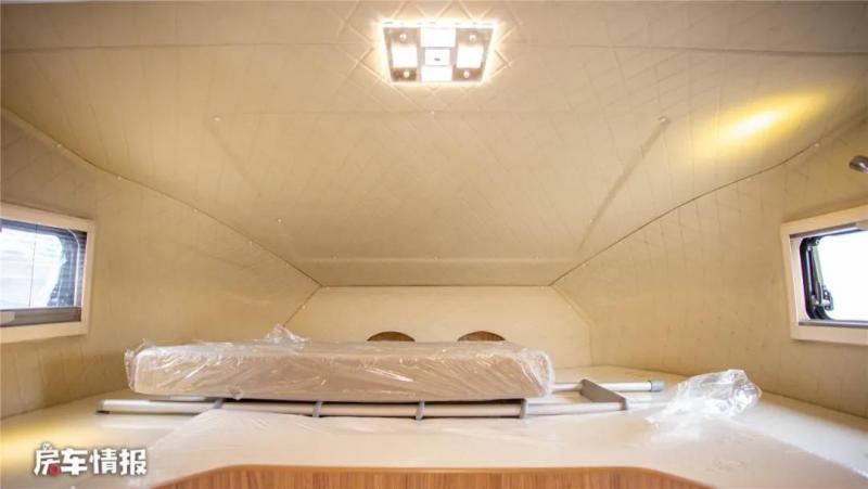 除去尾床之外在前方的驾驶室顶部还标配了一张尺寸为2200*1350mm的双人床,在床板下方还隐藏了一台32寸的液晶电视,以满足日常的娱乐需求。
