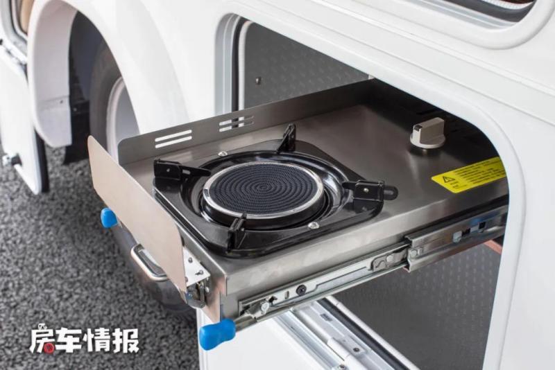 在车身外部同样配置了较为丰富的生活设施,包括右侧上方的遮阳棚、下方的抽拉式灶台以及左侧后方的储物舱,也可以满足基本的生活所需。
