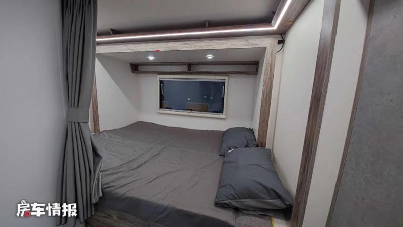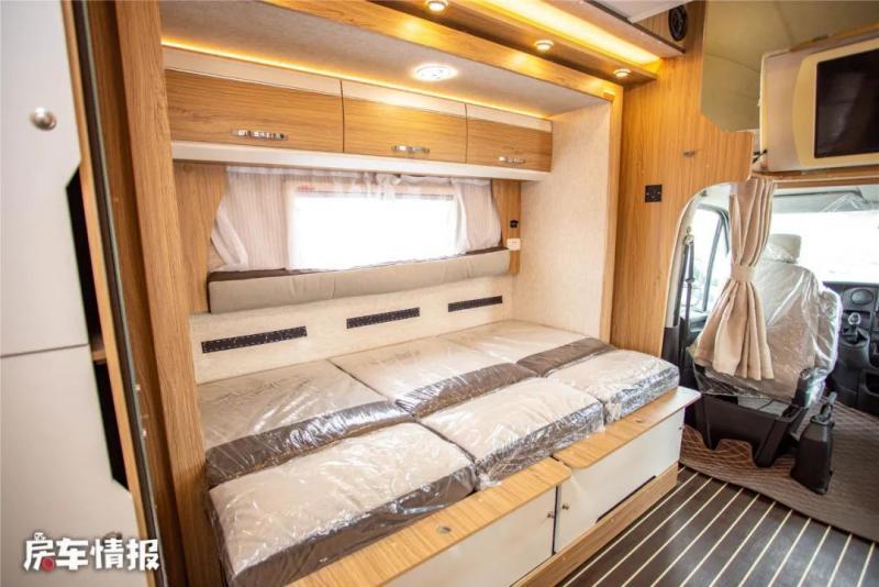 除去沙发床之外,在前方大额头区域内还提供了一张尺寸为2200mm*1470mm的额头床,足以满足两个成年人的睡眠需求。另外在床板下方也带有一台32寸的液晶电视,以提供基础的娱乐服务。