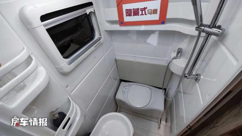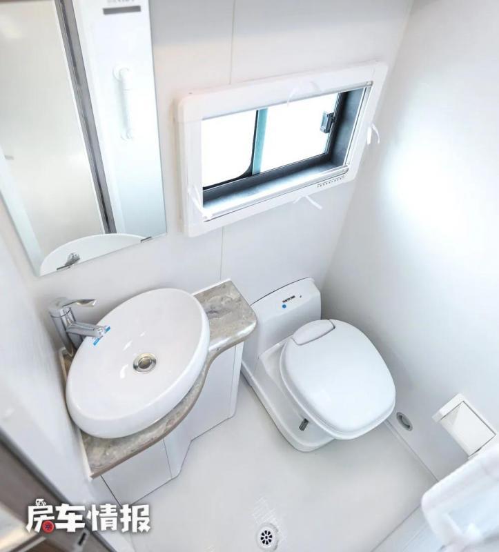 而车内的卫浴室采用了复合航空材料打造,可以做到防水防霉延长整体的使用寿命,内部配置了马桶、洗手台、淋浴花洒等基础洗漱设施,可以解决出行的洗漱需求。