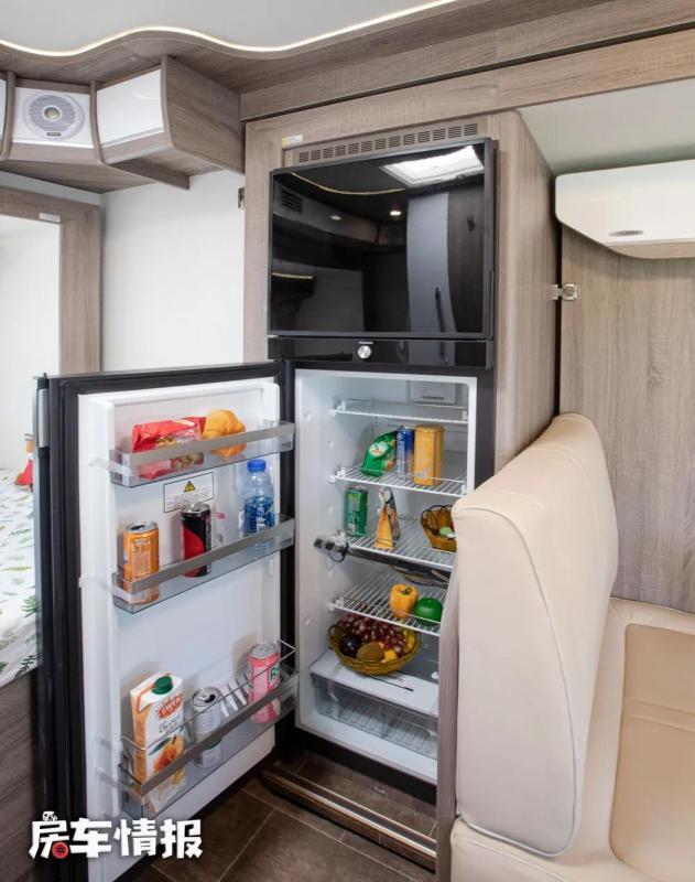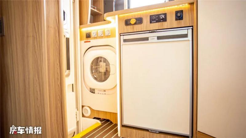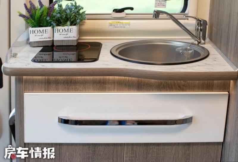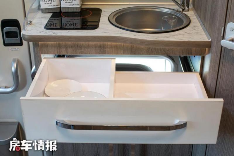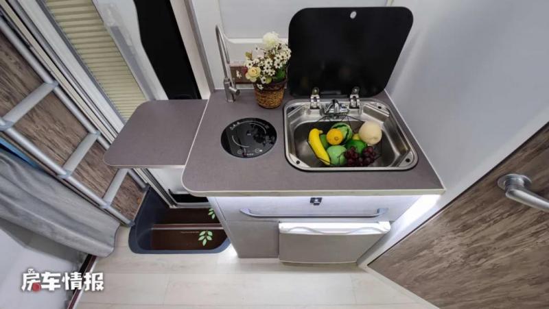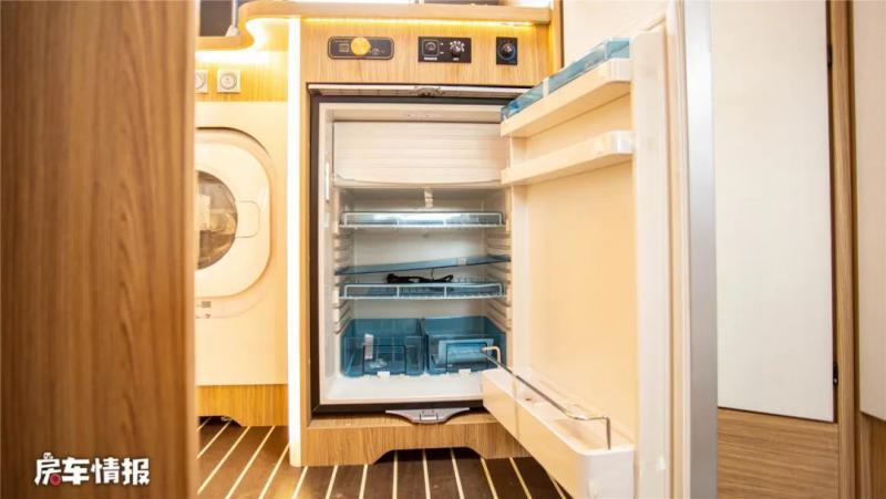 此外全车也提供了可以满足日常烹饪需求的厨房操作台,台面上提供了电磁炉和带盖的水槽,同时还配置了一台224L的上下双开门冰箱,足以存放一家人的食物。