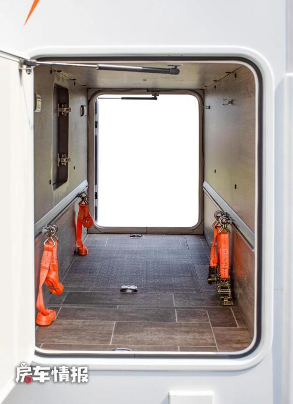 车身外部的配置也是非常丰富的,包括提供了遮阳棚、外置抽拉灶台、外置翻板,以及位于车厢尾部的贯通式储物舱,也能满足日常的生活所需,另外比较有意思的,这款房车在车身外部配置了一台洗衣机。