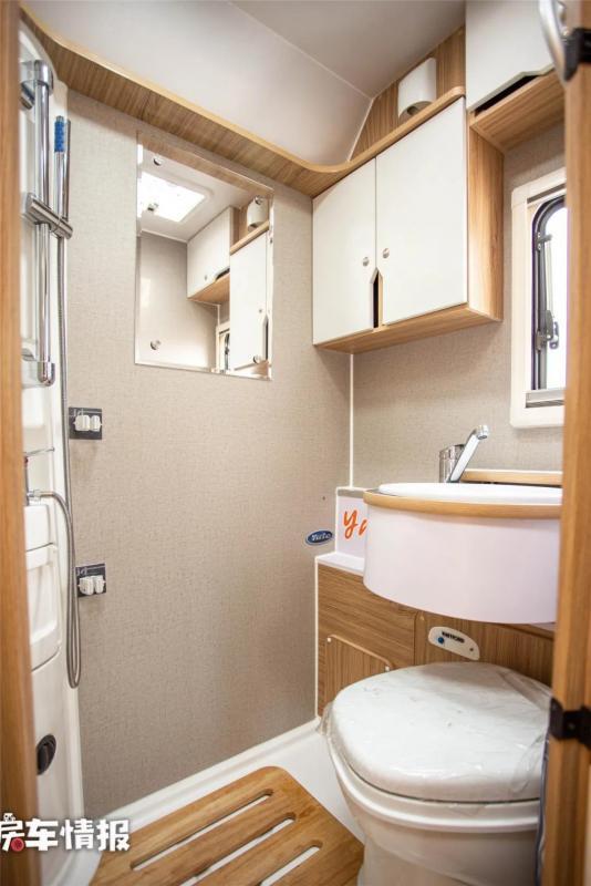 厨房操作台后方则是全车的独立卫浴室,内部也提供了相对齐全的洗漱设施,包括折叠的洗手台、置物架、淋浴花洒、梳妆镜以及一台可以隐藏的电动马桶,这个设计可以说非常少见了,一是采用隐藏式的可以灵活使用为洗澡时预留出更多的空间,而是采用电动调节又很方便。