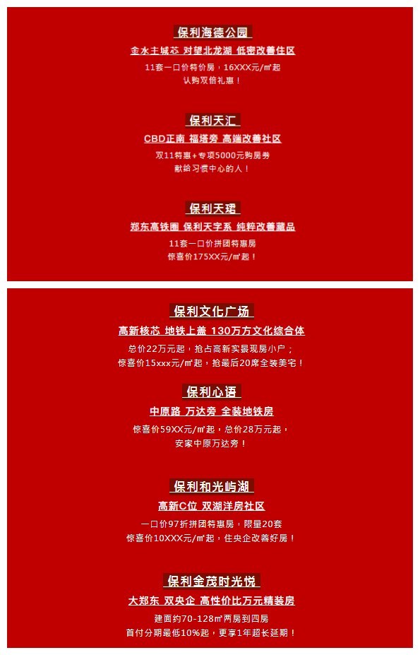 今年“双11”亦然,河南保利项目也并未躺平。保利天汇“双11”特惠+专项5000元购房券;保利天珺推出11套一口价拼团特惠房,惊喜价175××元/㎡起;保利海德公园11套一口价特价房,16×××元/㎡起;保利心语惊喜价59××元/㎡起,总价28万元起;保利文化广场总价22万元起抢现房小户,惊喜价15×××元/㎡;保利和光屿湖一口价97折拼团特惠房,限量20套,惊喜价10×××元/㎡起;保利金茂时光悦首付分期最低10%起,享1年超长延期。
