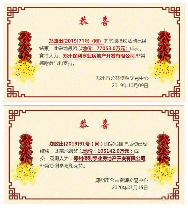 2019年10月9日、2020年1月15日保利分别以7.7053亿元、10.5142亿元得郑政出〔2019〕71号(网)、91号(网)地块,即保利海德公园项目,楼面价分别为4437元/㎡、4316元/㎡。
