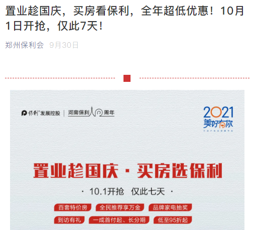 从“郑州保利会”释放的信息看,第四季度开始,河南保利旗下在售项目均展开了营销肉搏。从9月30日“全年抄底钜惠”开始,河南保利4城12盘联动推出国庆买房优惠。
