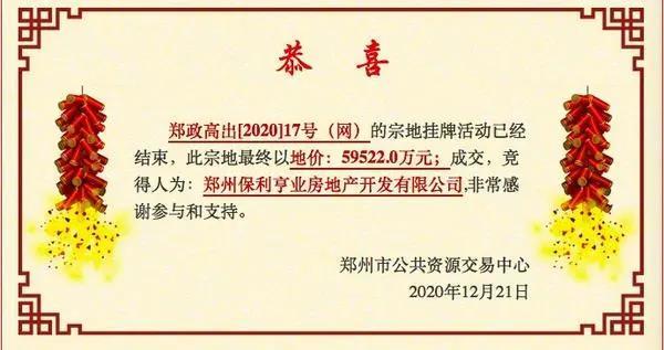 2020年12月21日,保利5.9522亿元竞得郑政高出〔2020〕17号(网)地块,刷新高新区双湖科技城楼面价,约6113元/㎡,溢价约23.18%。