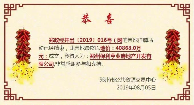 2019年8月5日,保利4.0868亿元竞得郑政经开出〔2019〕016号(网)地块,楼面价4945元/㎡, 溢价率6.79%,综合房价最高限价1.6万元/㎡。