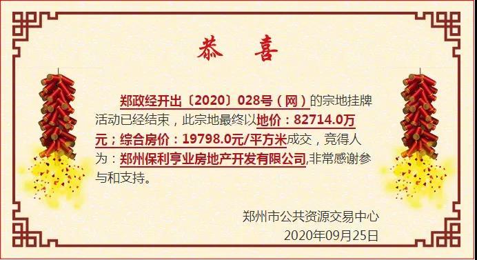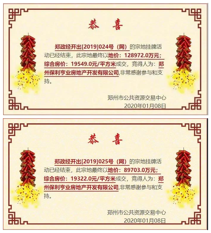 2020年1月8日,保利熔断价12.8972亿元竞得政经开出〔2019〕024号(网)地块,房屋成本指导价17759元/㎡,综合房价最高限价20759元/㎡。熔断价8.9703亿元竞得郑政经开出〔2019〕025号(网)地块,房屋成本指导价17769元/㎡,综合房价最高限价20769元/㎡。