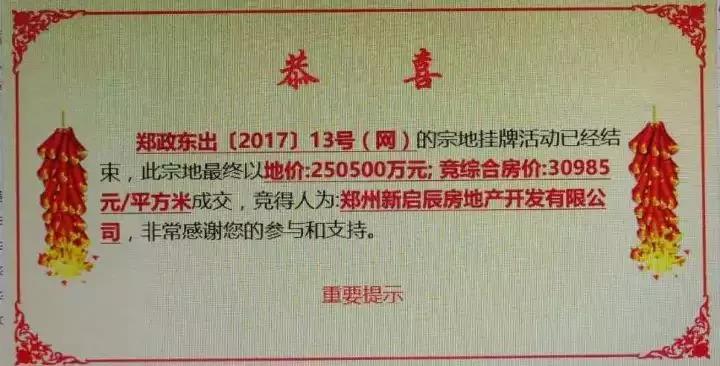 2017年11月16日,郑政东出〔2017〕13号地块经过149轮竞拍被保利收入囊中,成交价25.05亿元,楼面价24032元/㎡。
