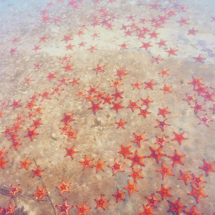 海星不会聚集在一个地方,要想拍出好照片,就得沿着沙滩多走走,把它们一个一个捡起来。注意,海星离开海水太久就会死亡,因此您必须确保它们始终浸泡在水中。拍完照片后,可以让它们自己游走。有时它们也会被渔民的渔网缠住,但他们会立即捡起来扔回海里。