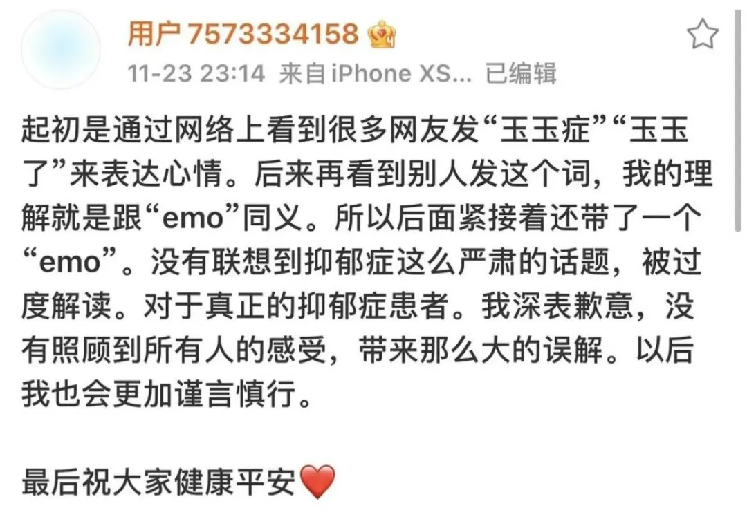 表示自己曲解了玉玉症的真正含义,以为只是和emo同义。并没有想到那么多。